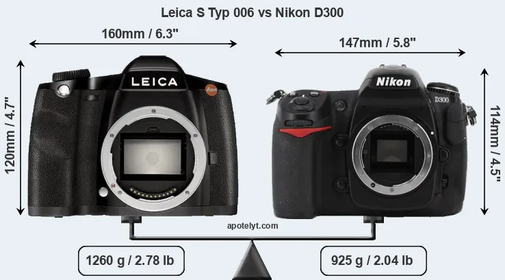 The physical size and weight of the Leica S Typ 006 and the Nikon D300 are illustrated in the side-by-side display below. The two cameras are presented according to their relative size. Three consecutive perspectives from the front, the top, and the back are available. All width, height and depth dimensions are rounded to the nearest millimeter.