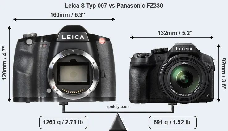 An illustration of the physical size and weight of the Leica S Typ 007 and the Panasonic FZ330 is provided in the side-by-side display below. The two cameras are presented according to their relative size. Three successive views from the front, the top, and the rear are shown. All width, height and depth dimensions are rounded to the nearest millimeter.