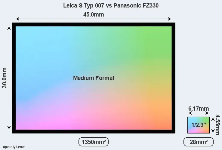 Of the two cameras under consideration, the Leica S Typ 007 features a medium format sensor and the Panasonic FZ330 a 1/2.3-inch sensor. The sensor area in the FZ330 is 98 percent smaller. As a result of these sensor size differences, the cameras have a format factor of, respectively, 0.8 and 5.6. The sensor in the S Typ 007 has a native 3:2 aspect ratio, while the one in the FZ330 offers a 4:3 aspect.