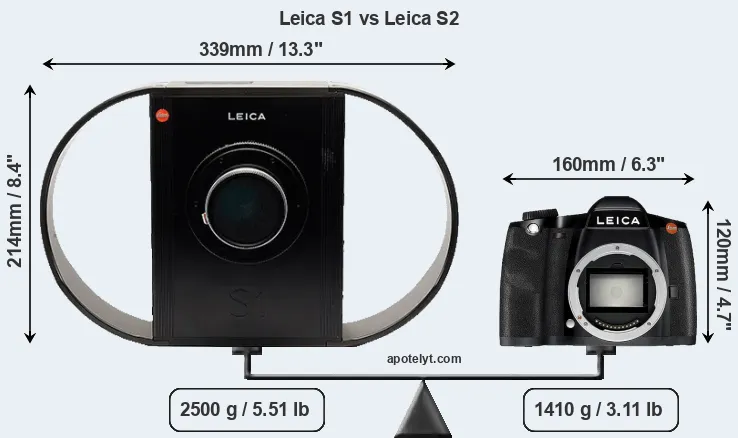 If the front view area (width x height) of the cameras is taken as an aggregate measure of their size, the Leica S2 is considerably smaller (74 percent) than the Leica S1. Moreover, the S2 is substantially lighter (44 percent) than the S1. It is noteworthy in this context that the S2 is splash and dust-proof, while the S1 does not feature any corresponding weather-sealing.