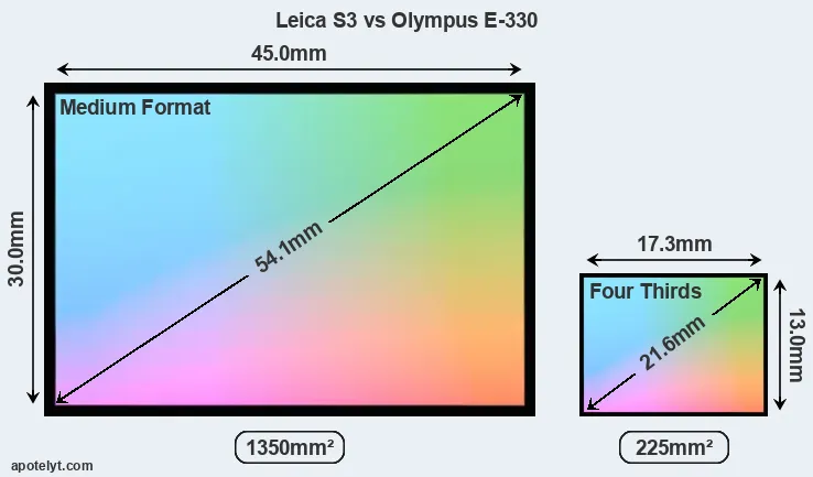 Of the two cameras under consideration, the Leica S3 features a medium format sensor and the Olympus E-330 a Four Thirds sensor. The sensor area in the E-330 is 83 percent smaller. As a result of these sensor size differences, the cameras have a format factor of, respectively, 0.8 and 2.0. The sensor in the S3 has a native 3:2 aspect ratio, while the one in the E-330 offers a 4:3 aspect.