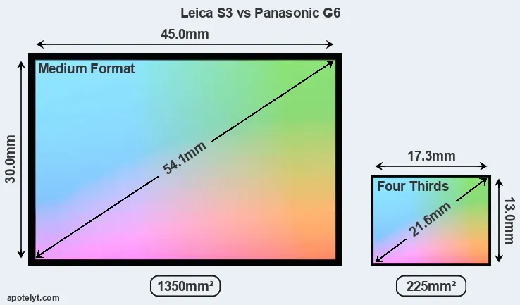 Of the two cameras under consideration, the Leica S3 features a medium format sensor and the Panasonic G6 a Four Thirds sensor. The sensor area in the G6 is 83 percent smaller. As a result of these sensor size differences, the cameras have a format factor of, respectively, 0.8 and 2.0. The sensor in the S3 has a native 3:2 aspect ratio, while the one in the G6 offers a 4:3 aspect.