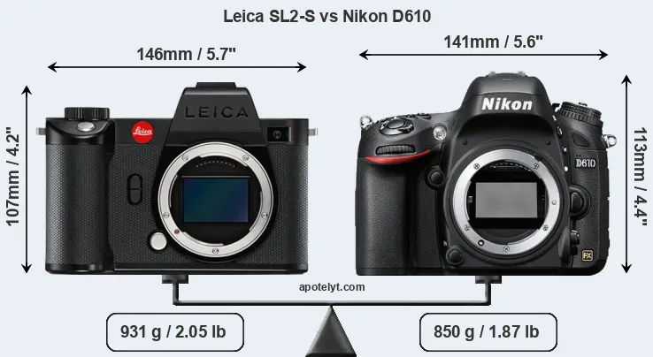 The physical size and weight of the Leica SL2-S and the Nikon D610 are illustrated in the side-by-side display below. The two cameras are presented according to their relative size. Three successive views from the front, the top, and the rear are shown. All width, height and depth dimensions are rounded to the nearest millimeter.