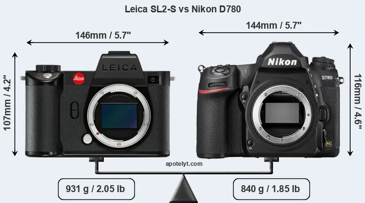 An illustration of the physical size and weight of the Leica SL2-S and the Nikon D780 is provided in the side-by-side display below. The two cameras are presented according to their relative size. Three consecutive perspectives from the front, the top, and the back are available. All width, height and depth dimensions are rounded to the nearest millimeter.