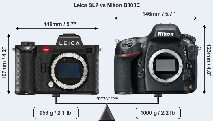 The physical size and weight of the Leica SL2 and the Nikon D800E are illustrated in the side-by-side display below. The two cameras are presented according to their relative size. Three consecutive views from the front, the top, and the rear side are shown. All size dimensions are rounded to the nearest millimeter.