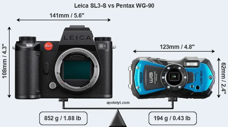 An illustration of the physical size and weight of the Leica SL3-S and the Pentax WG-90 is provided in the side-by-side display below. The two cameras are presented according to their relative size. Three consecutive views from the front, the top, and the rear side are shown. All width, height and depth measures are rounded to the nearest millimeter.