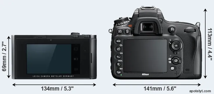The physical size and weight of the Leica T and the Nikon D600 are illustrated in the side-by-side display below. The two cameras are presented according to their relative size. Three consecutive perspectives from the front, the top, and the back are available. All width, height and depth dimensions are rounded to the nearest millimeter.
