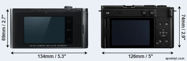 If the front view area (width x height) of the cameras is taken as an aggregate measure of their size, the Leica T and the Panasonic S9 are of equal size. However, the S9 is markedly heavier (27 percent) than the T Typ 701. In this context, it is worth noting that neither the T Typ 701 nor the S9 are weather-sealed.