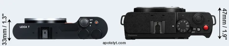 The side-by-side display below illustrates the physical size and weight of the Leica T and the Panasonic S9. The two cameras are presented according to their relative size. Three consecutive perspectives from the front, the top, and the back are available. All width, height and depth dimensions are rounded to the nearest millimeter.
