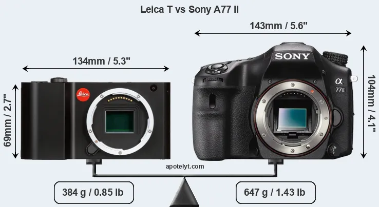 If the front view area (width x height) of the cameras is taken as an aggregate measure of their size, the Sony A77 II is considerably larger (61 percent) than the Leica T. Moreover, the A77 II is substantially heavier (68 percent) than the T Typ 701. It is noteworthy in this context that the A77 II is splash and dust-proof, while the T Typ 701 does not feature any corresponding weather-sealing.