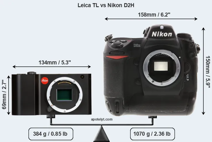 If the front view area (width x height) of the cameras is taken as an aggregate measure of their size, the Nikon D2H is considerably larger (156 percent) than the Leica TL. Moreover, the D2H is substantially heavier (179 percent) than the TL. It is noteworthy in this context that the D2H is splash and dust-proof, while the TL does not feature any corresponding weather-sealing.
