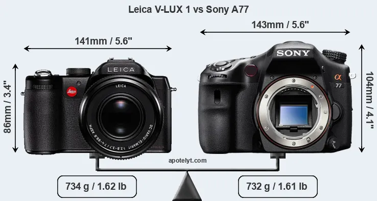 If the front view area (width x height) of the cameras is taken as an aggregate measure of their size, the Sony A77 is notably larger (23 percent) than the Leica V-LUX 1. It is noteworthy in this context that the A77 is splash and dust-proof, while the V-LUX 1 does not feature any corresponding weather-sealing.