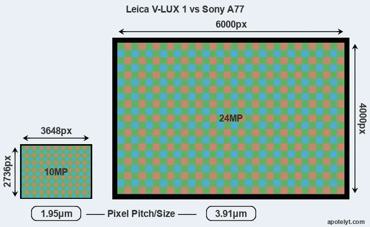 | Sensor Specs | Leica V-LUX 1 | Sony A77 |