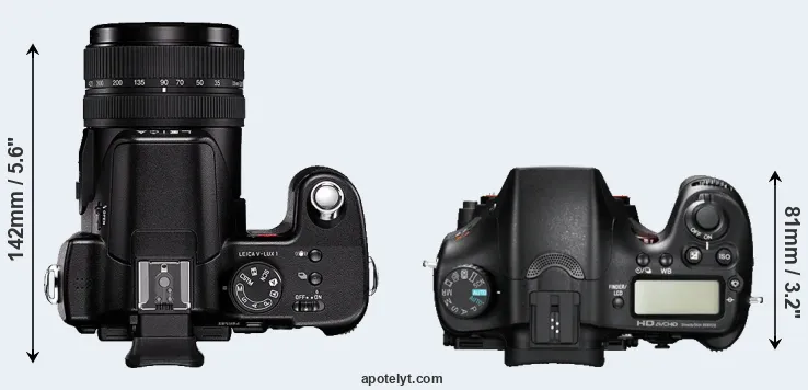 The physical size and weight of the Leica V-LUX 1 and the Sony A77 are illustrated in the side-by-side display below. The two cameras are presented according to their relative size. Three consecutive views from the front, the top, and the rear side are shown. All size dimensions are rounded to the nearest millimeter.