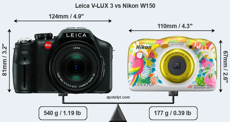 An illustration of the physical size and weight of the Leica V-LUX 3 and the Nikon W150 is provided in the side-by-side display below. The two cameras are presented according to their relative size. Three consecutive perspectives from the front, the top, and the back are available. All width, height and depth measures are rounded to the nearest millimeter.