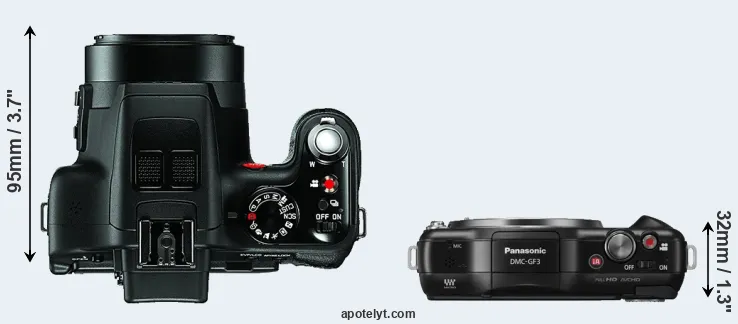 The side-by-side display below illustrates the physical size and weight of the Leica V-LUX 3 and the Panasonic GF3. The two cameras are presented according to their relative size. Three successive views from the front, the top, and the rear are shown. All width, height and depth dimensions are rounded to the nearest millimeter.