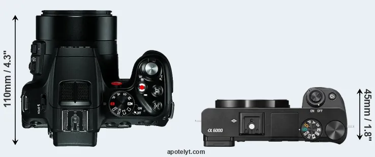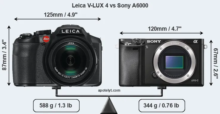 The side-by-side display below illustrates the physical size and weight of the Leica V-LUX 4 and the Sony A6000. The two cameras are presented according to their relative size. Three successive views from the front, the top, and the rear are shown. All width, height and depth measures are rounded to the nearest millimeter.