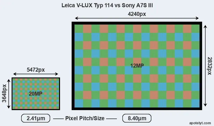 Despite having a smaller sensor, the Leica V-LUX Typ 114 offers a higher resolution of 20 megapixels, compared with 12 MP of the Sony A7S III. This megapixels advantage comes at the cost of a higher pixel density and a smaller size of the individual pixel (with a pixel pitch of 2.41μm versus 8.40μm for the A7S III). Moreover, it should be noted that the A7S III is much more recent (by 5 years and 10 months) than the V-LUX Typ 114, and its sensor will have benefitted from technological advances during this time that further enhance the light gathering capacity of its pixel-units.