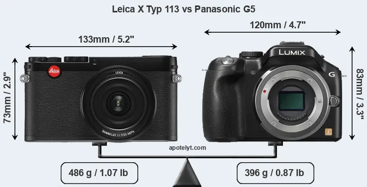 If the front view area (width x height) of the cameras is taken as an aggregate measure of their size, the Panasonic G5 is somewhat larger (3 percent) than the Leica X Typ 113. In this context, it is worth noting that neither the X Typ 113 nor the G5 are weather-sealed.