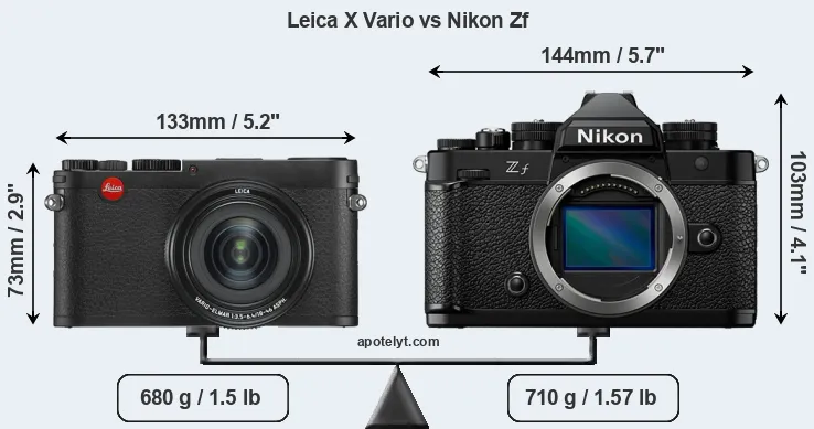 If the front view area (width x height) of the cameras is taken as an aggregate measure of their size, the Nikon Zf is considerably larger (53 percent) than the Leica X Vario. It is noteworthy in this context that the Zf is splash and dust-proof, while the X Vario does not feature any corresponding weather-sealing.