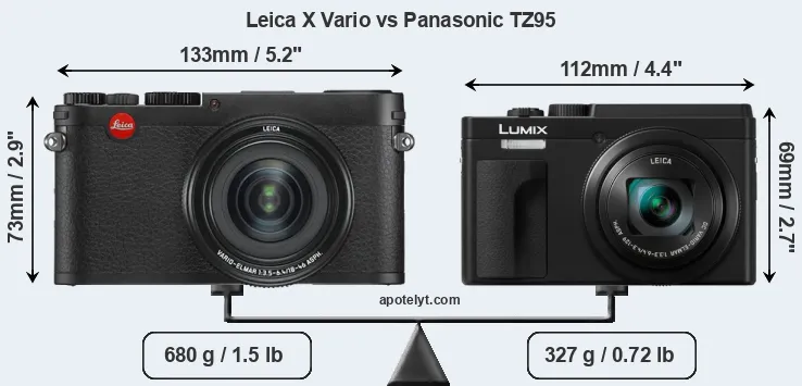 If the front view area (width x height) of the cameras is taken as an aggregate measure of their size, the Panasonic TZ95 is notably smaller (20 percent) than the Leica X Vario. Moreover, the TZ95 is substantially lighter (52 percent) than the X Vario. In this context, it is worth noting that neither the X Vario nor the TZ95 are weather-sealed.