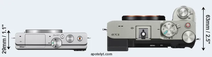 An illustration of the physical size and weight of the Nikon 1 J4 and the Sony A7C II is provided in the side-by-side display below. The two cameras are presented according to their relative size. Three successive views from the front, the top, and the rear are shown. All width, height and depth dimensions are rounded to the nearest millimeter.