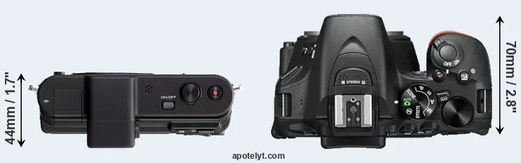 The physical size and weight of the Nikon 1 V1 and the Nikon D5500 are illustrated in the side-by-side display below. The two cameras are presented according to their relative size. Three consecutive views from the front, the top, and the rear side are shown. All size dimensions are rounded to the nearest millimeter.