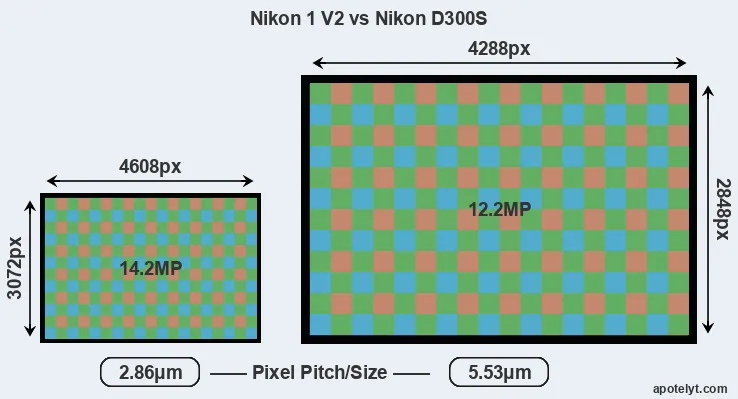 Despite having a smaller sensor, the Nikon 1 V2 offers a higher resolution of 14.2 megapixels, compared with 12.2 MP of the Nikon D300S. This megapixels advantage comes at the cost of a higher pixel density and a smaller size of the individual pixel (with a pixel pitch of 2.86μm versus 5.53μm for the D300S). However, it should be noted that the V2 is much more recent (by 3 years and 2 months) than the D300S, and its sensor will have benefitted from technological advances during this time that make it possible to gather light more efficiently.