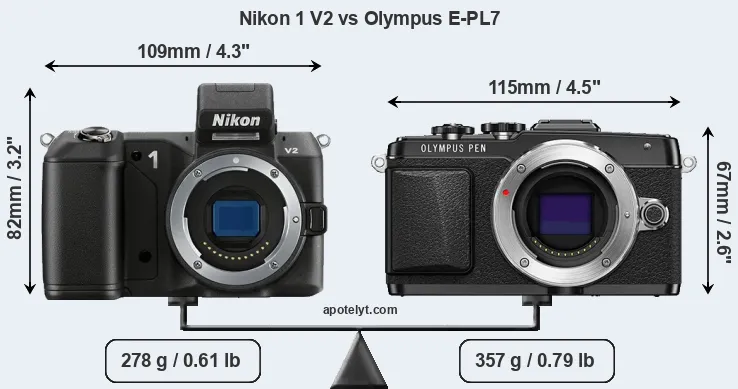 Going beyond this snapshot of core features and characteristics, what are the differences between the Nikon 1 V2 and the Olympus PEN E-PL7? Which one should you buy? Read on to find out how these two cameras compare with respect to their body size, their imaging sensors, their shooting features, their input-output connections, and their reception by expert reviewers.