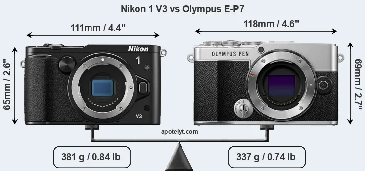 The physical size and weight of the Nikon 1 V3 and the Olympus E-P7 are illustrated in the side-by-side display below. The two cameras are presented according to their relative size. Three successive views from the front, the top, and the rear are shown. All width, height and depth measures are rounded to the nearest millimeter.