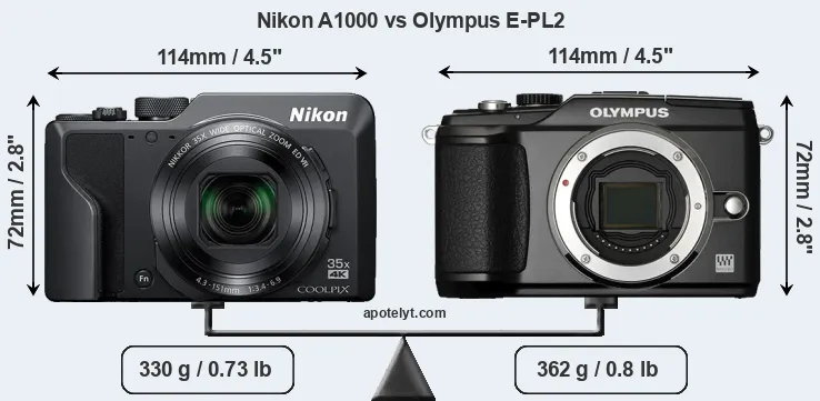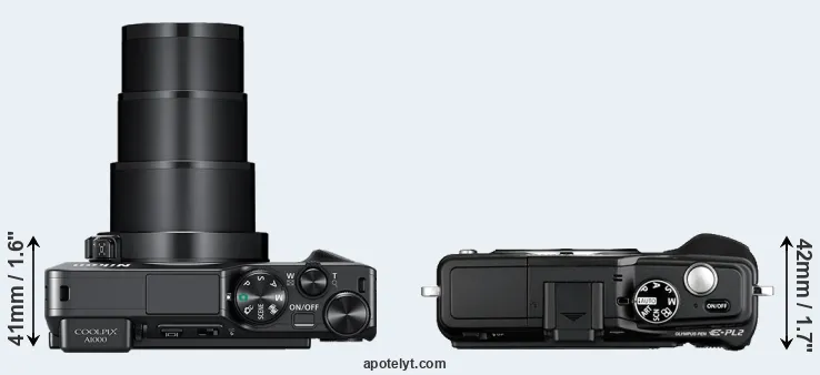 In this particular case, the Nikon A1000 and the Olympus E-PL2 have exactly the same width and height, and, thus, have identically-sized bodies. In this context, it is worth noting that neither the A1000 nor the E-PL2 are weather-sealed.