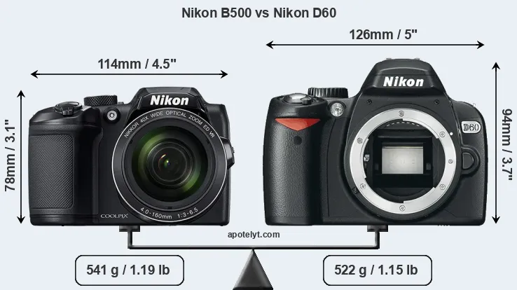 The physical size and weight of the Nikon B500 and the Nikon D60 are illustrated in the side-by-side display below. The two cameras are presented according to their relative size. Three consecutive perspectives from the front, the top, and the back are available. All width, height and depth measures are rounded to the nearest millimeter.