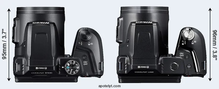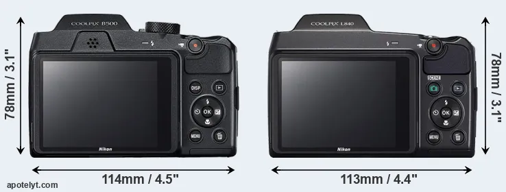 An illustration of the physical size and weight of the Nikon B500 and the Nikon L840 is provided in the side-by-side display below. The two cameras are presented according to their relative size. Three successive views from the front, the top, and the rear are shown. All width, height and depth measures are rounded to the nearest millimeter.