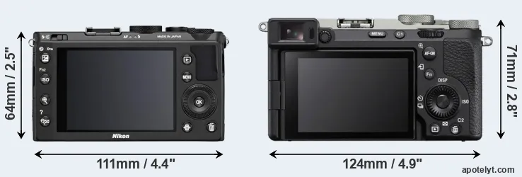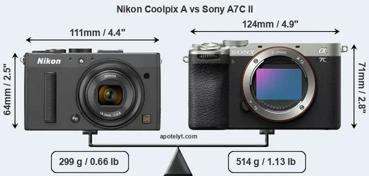 An illustration of the physical size and weight of the Nikon Coolpix A and the Sony A7C II is provided in the side-by-side display below. The two cameras are presented according to their relative size. Three successive views from the front, the top, and the rear are shown. All width, height and depth measures are rounded to the nearest millimeter.