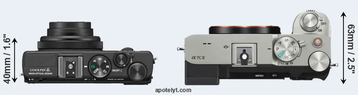 If the front view area (width x height) of the cameras is taken as an aggregate measure of their size, the Sony A7C II is notably larger (24 percent) than the Nikon Coolpix A. It is noteworthy in this context that the A7C II is splash and dust-proof, while the Coolpix A does not feature any corresponding weather-sealing.