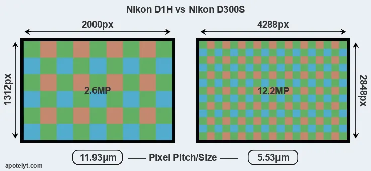 With 12.2MP, the D300S offers a higher resolution than the D1H (2.6MP), but the D300S has smaller individual pixels (pixel pitch of 5.53μm versus 11.93μm for the D1H). Yet, the D300S is a much more recent model (by 8 years and 5 months) than the D1H, and its sensor will have benefitted from technological advances during this time that enhance the light gathering capacity of its pixel-units.