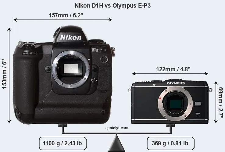 The side-by-side display below illustrates the physical size and weight of the Nikon D1H and the Olympus E-P3. The two cameras are presented according to their relative size. Three consecutive views from the front, the top, and the rear side are shown. All width, height and depth measures are rounded to the nearest millimeter.
