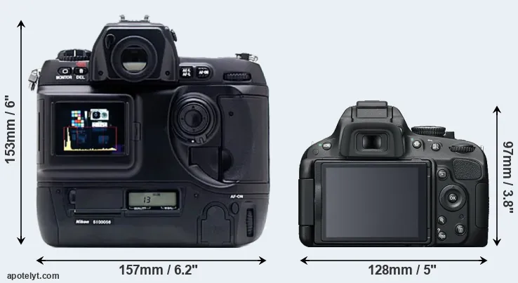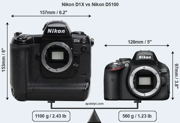 The side-by-side display below illustrates the physical size and weight of the Nikon D1X and the Nikon D5100. The two cameras are presented according to their relative size. Three consecutive views from the front, the top, and the rear side are shown. All width, height and depth dimensions are rounded to the nearest millimeter.