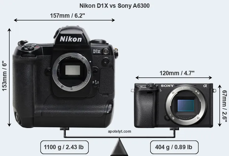 An illustration of the physical size and weight of the Nikon D1X and the Sony A6300 is provided in the side-by-side display below. The two cameras are presented according to their relative size. Three consecutive perspectives from the front, the top, and the back are available. All size dimensions are rounded to the nearest millimeter.