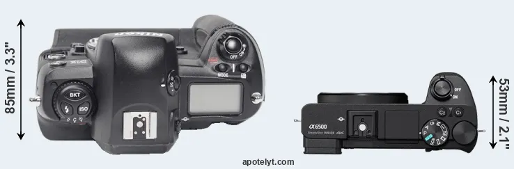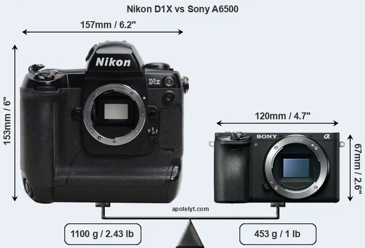 An illustration of the physical size and weight of the Nikon D1X and the Sony A6500 is provided in the side-by-side display below. The two cameras are presented according to their relative size. Three consecutive perspectives from the front, the top, and the back are available. All size dimensions are rounded to the nearest millimeter.
