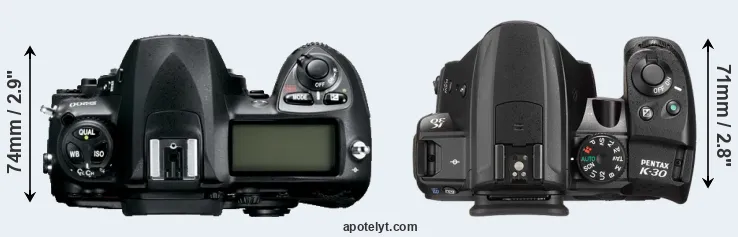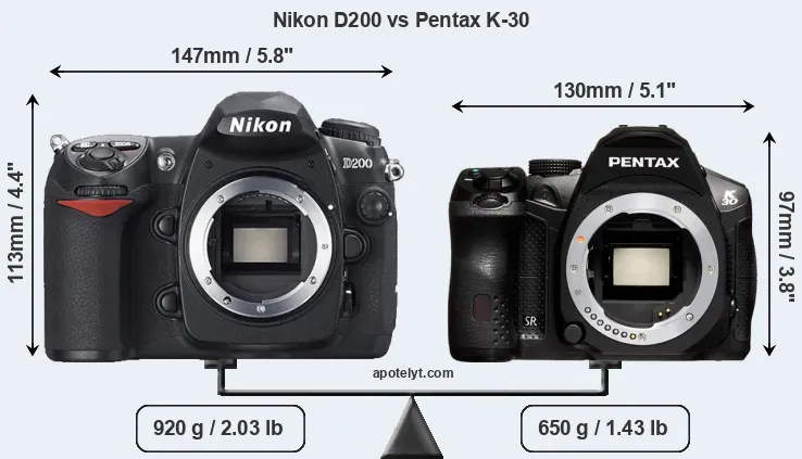 The side-by-side display below illustrates the physical size and weight of the Nikon D200 and the Pentax K-30. The two cameras are presented according to their relative size. Three consecutive perspectives from the front, the top, and the back are available. All width, height and depth dimensions are rounded to the nearest millimeter.