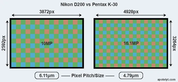 Despite having a slightly smaller sensor, the K-30 offers a higher resolution of 16.1 megapixels, compared with 10 MP of the D200. This megapixels advantage comes at the cost of a higher pixel density and a smaller size of the individual pixel (with a pixel pitch of 4.79μm versus 6.11μm for the D200). However, it should be noted that the K-30 is much more recent (by 6 years and 6 months) than the D200, and its sensor will have benefitted from technological advances during this time that make it possible to gather light more efficiently.