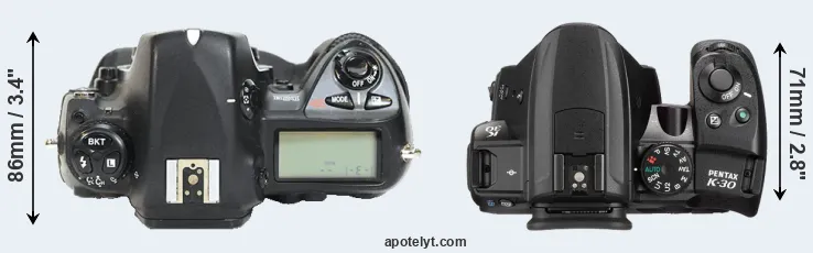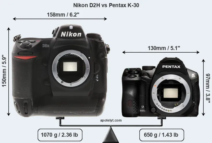 The side-by-side display below illustrates the physical size and weight of the Nikon D2H and the Pentax K-30. The two cameras are presented according to their relative size. Three consecutive perspectives from the front, the top, and the back are available. All size dimensions are rounded to the nearest millimeter.