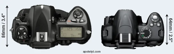 The side-by-side display below illustrates the physical size and weight of the Nikon D2X and the Nikon D3000. The two cameras are presented according to their relative size. Three successive views from the front, the top, and the rear are shown. All size dimensions are rounded to the nearest millimeter.