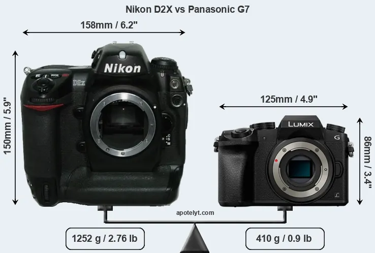 The side-by-side display below illustrates the physical size and weight of the Nikon D2X and the Panasonic G7. The two cameras are presented according to their relative size. Three consecutive perspectives from the front, the top, and the back are available. All width, height and depth measures are rounded to the nearest millimeter.