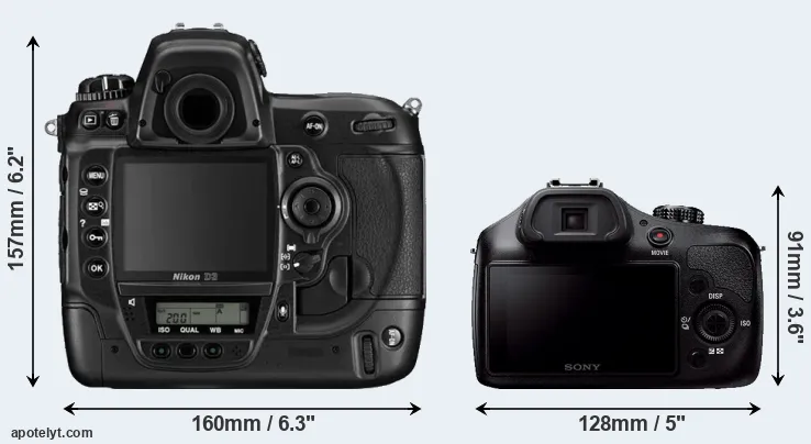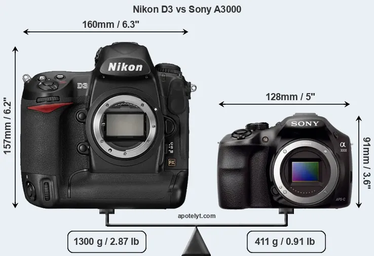 An illustration of the physical size and weight of the Nikon D3 and the Sony A3000 is provided in the side-by-side display below. The two cameras are presented according to their relative size. Three consecutive perspectives from the front, the top, and the back are available. All width, height and depth dimensions are rounded to the nearest millimeter.