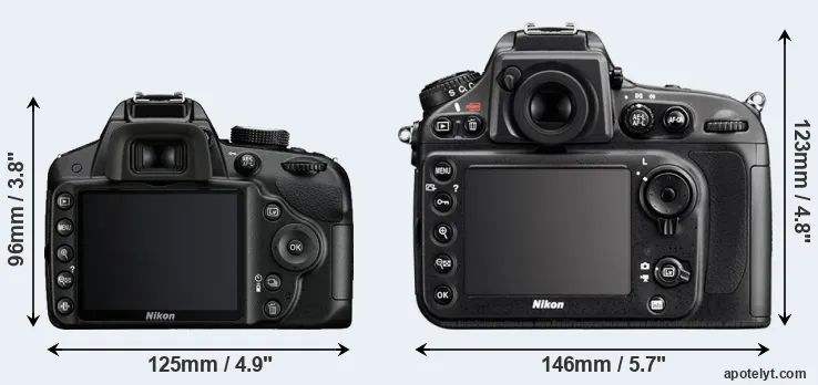 The side-by-side display below illustrates the physical size and weight of the Nikon D3200 and the Nikon D800E. The two cameras are presented according to their relative size. Three consecutive views from the front, the top, and the rear side are shown. All width, height and depth dimensions are rounded to the nearest millimeter.