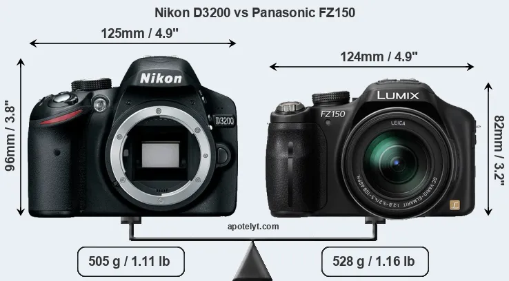 An illustration of the physical size and weight of the Nikon D3200 and the Panasonic FZ150 is provided in the side-by-side display below. The two cameras are presented according to their relative size. Three successive views from the front, the top, and the rear are shown. All width, height and depth dimensions are rounded to the nearest millimeter.