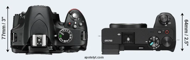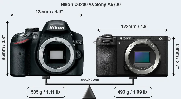 If the front view area (width x height) of the cameras is taken as an aggregate measure of their size, the Sony A6700 is considerably smaller (30 percent) than the Nikon D3200. Moreover, the A6700 is slightly lighter (2 percent) than the D3200. It is noteworthy in this context that the A6700 is splash and dust-proof, while the D3200 does not feature any corresponding weather-sealing.