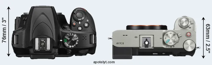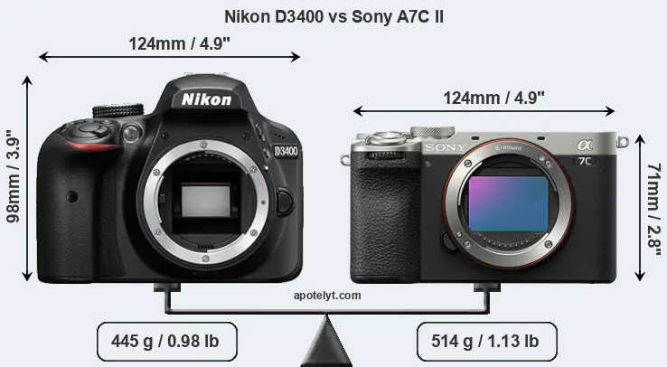 The physical size and weight of the Nikon D3400 and the Sony A7C II are illustrated in the side-by-side display below. The two cameras are presented according to their relative size. Three consecutive perspectives from the front, the top, and the back are available. All width, height and depth dimensions are rounded to the nearest millimeter.